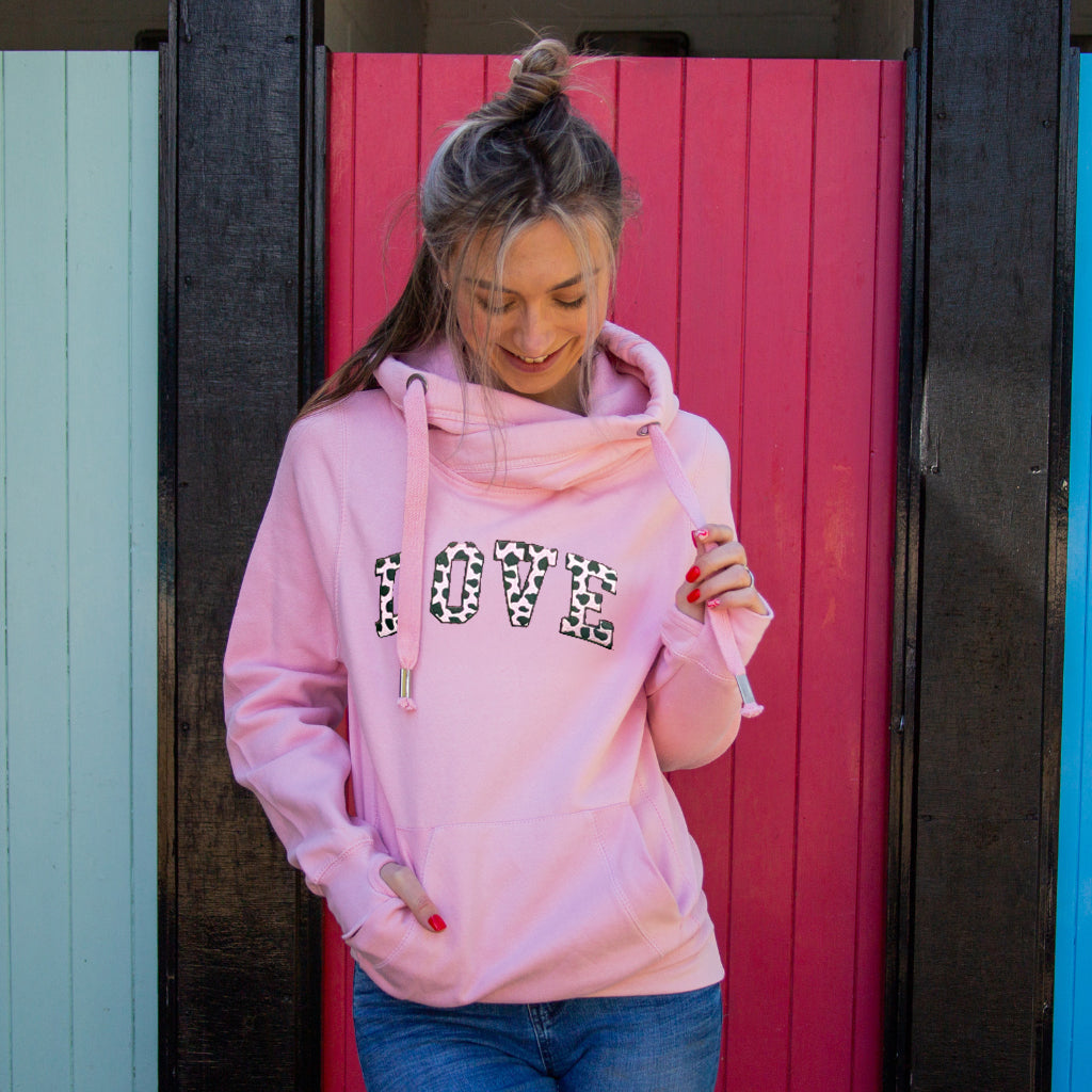 You all adore our gorgeous cowl neck hoodie and we love this feminine colour and the fabulous embroidered LOVE in animal print.