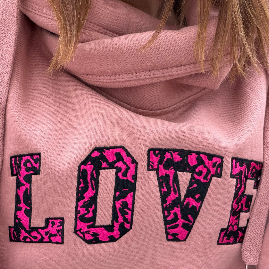 Embroidered Animal Print Love Cowl Neck Hoodie in Dusty Pink