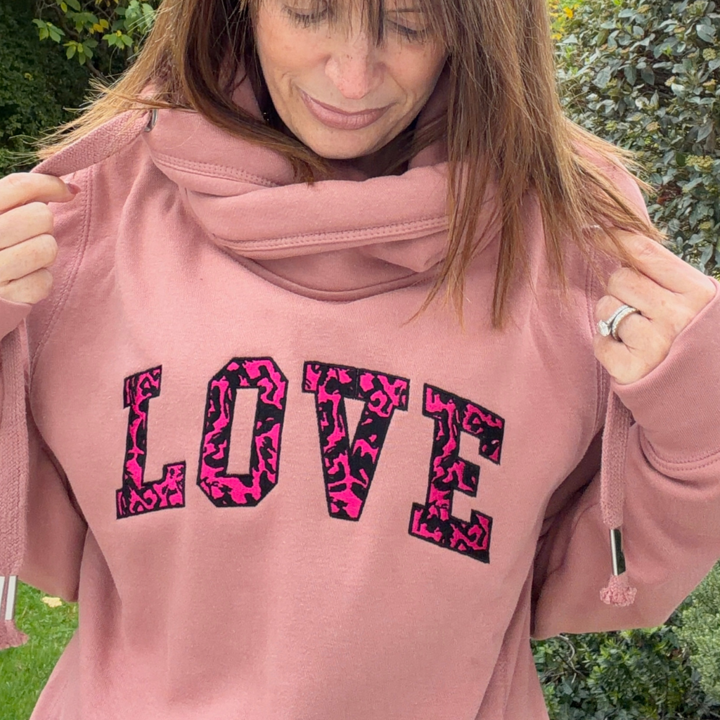 You all adore our gorgeous cowl neck hoodie and we love this feminine colour and the fabulous embroidered LOVE in animal print.