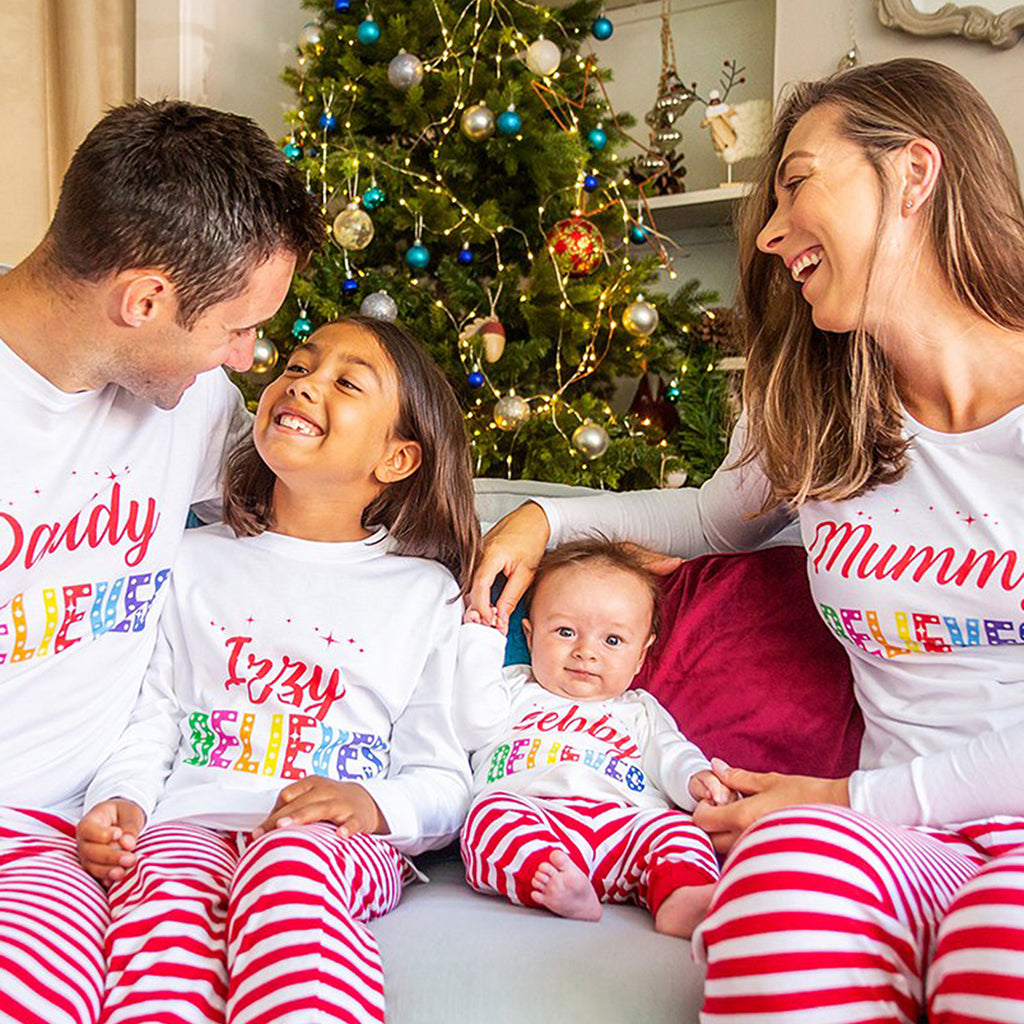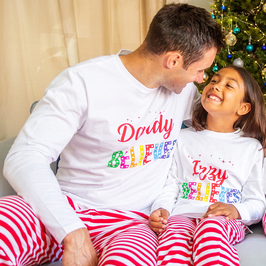 Kids super cute 'Believes' Christmas pyjamas with red candy stripe bottoms. Add your very own childs name to personalise them. Matching daddy, mummy and baby pyjamas also available making them a fabulous gift for the whole family.