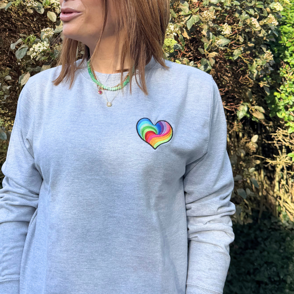 A heart, but make it Percy & Nell!!  We love the super fun and vibrant embroidery on this classic grey sweatshirt. An easy every day staple, this sweatshirt will go with most things in your wardrobe!
