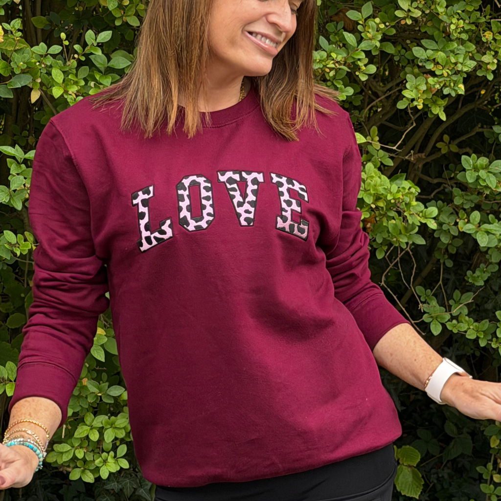We have elevated our embroidered LOVE slogan by adding a fabulous animal print design and putting on this season's hottest colour, burgundy. We simply LOVE how it has all come together. This sweatshirt is the perfect autumnal piece.