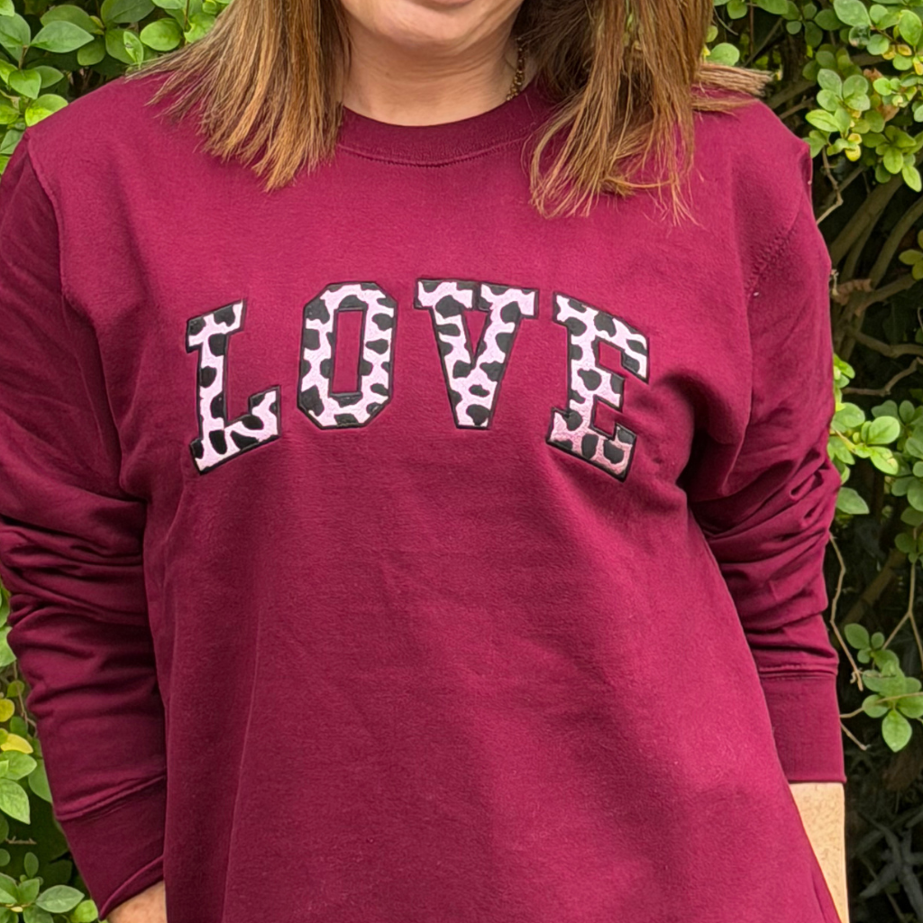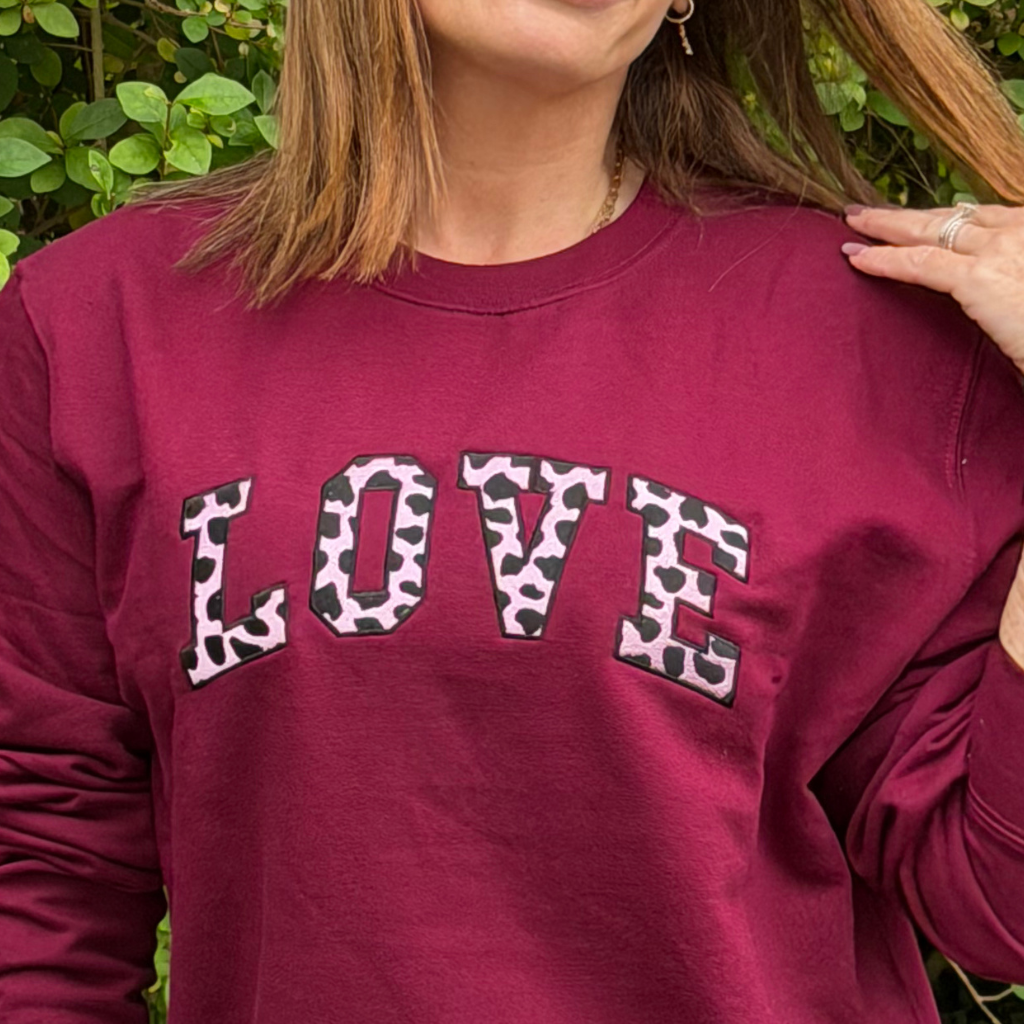 Embroidered Animal Print Love on Burgundy Sweatshirt