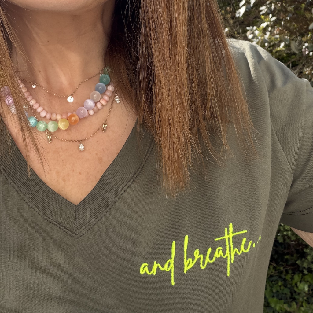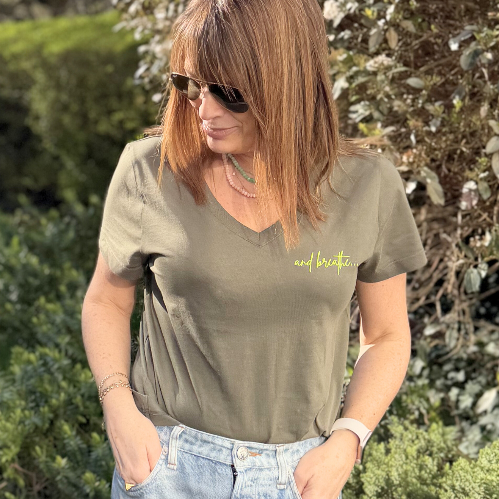 Our “and breathe…” V-neck t-shirt is designed as a gentle reminder to slow down, reset, and find your balance — wherever the day takes you. Thoughtfully created in a soft khaki tone, it’s finished with neon yellow embroidery for a fresh, uplifting pop of colour.