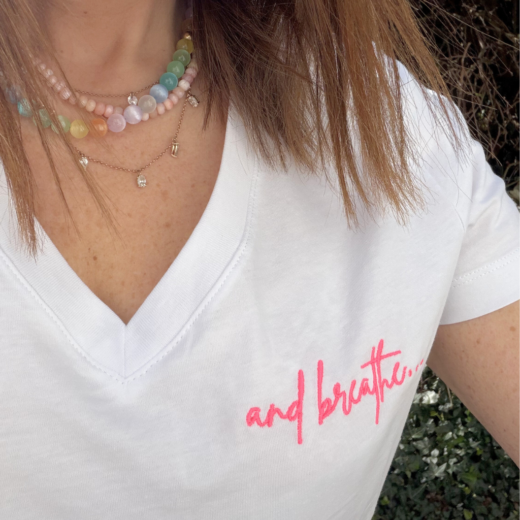Our “and breathe…” V-neck t-shirt is designed as a gentle reminder to slow down, reset, and find your balance — wherever the day takes you. Thoughtfully created in crisp white, it’s finished with neon pink embroidery for a fresh, uplifting pop of colour.